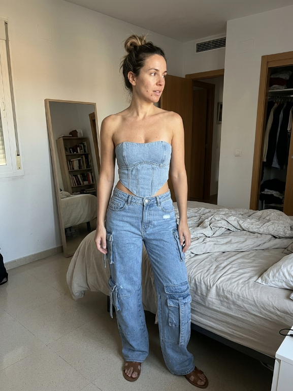 El corset estiliza la cintura y define la figura, mientras que los pantalones cargo de corte ancho aportan comodidad y un estilo desenfadado perfecto para el día o la noche.